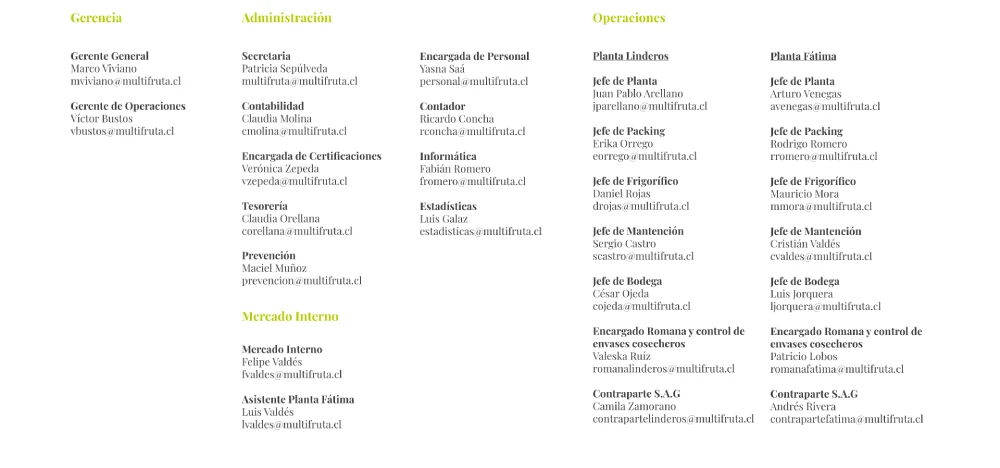 En estos 20 años el equipo humano que da vida a Multifruta S.A. ha sido responsable de brindar servicios de calidad, óptimos y eficientes. Esta actitud nos permite mejora continua en todos nuestros procesos productivos obteniendo sustentabilidad a lo largo de nuestra cadena de valor.